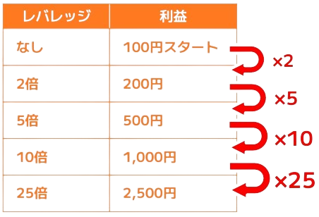 レバレッジを何倍にすると利益がいくらになるかを下記の表にまとめました。
